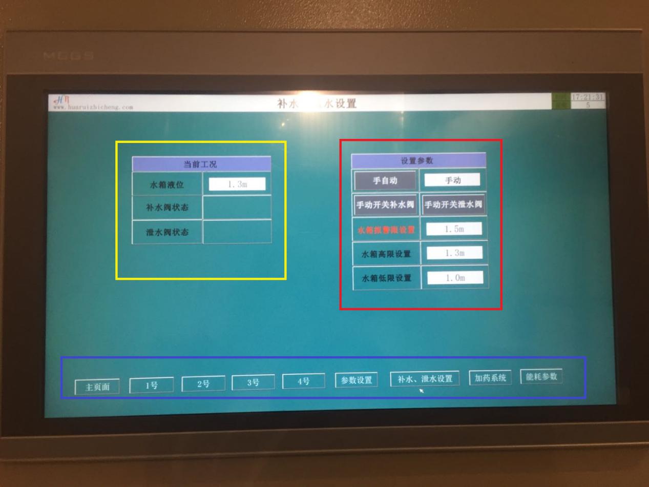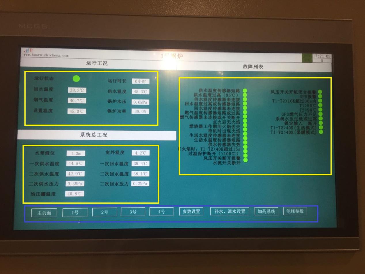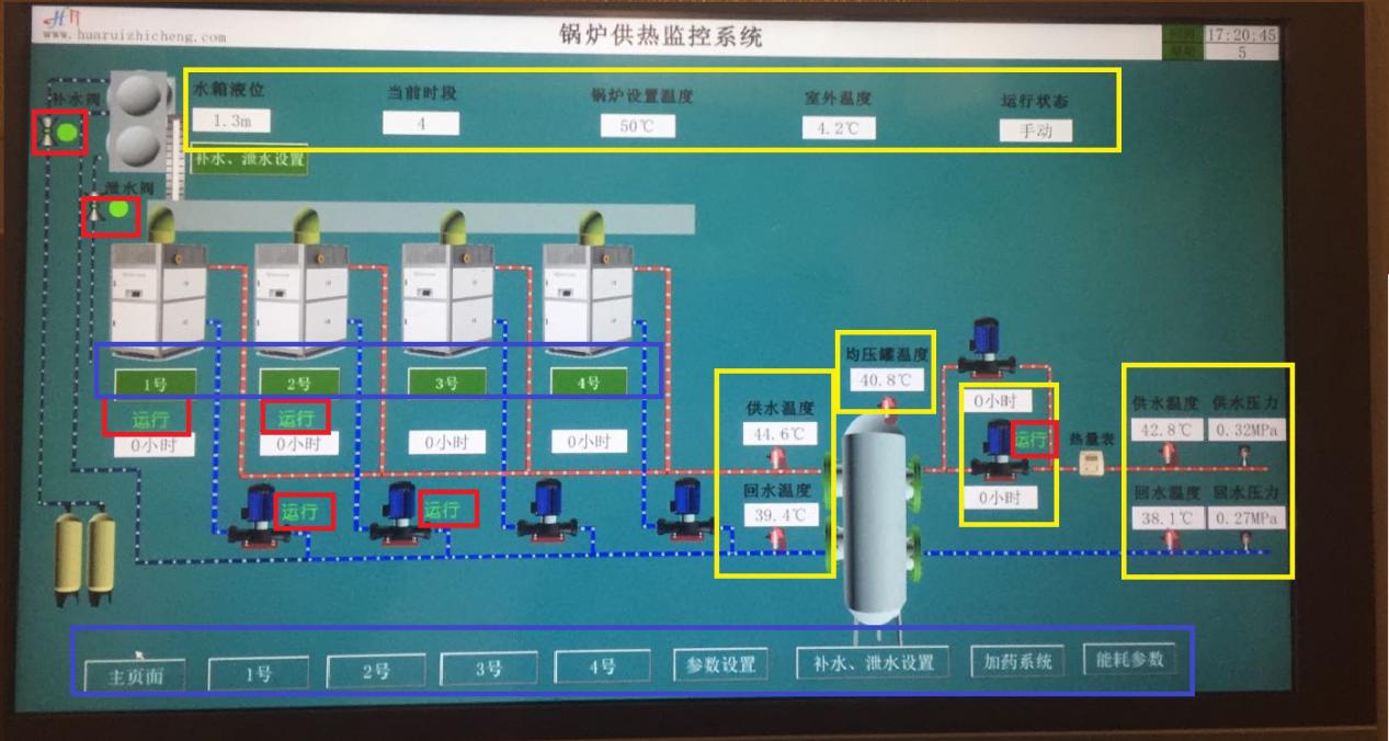 2.1.1. 系统参数(黄框内) Ø 室外温度、锅炉供回水温度、系统供回水温度、系统供回水压力、均压罐内温度 Ø 各设备运行时长 Ø 水箱液位、当前运行时段、锅炉设置温度、运行状态(手动、自动) 其中水箱液位为水箱实际液位,相关操作在补水、泄水设置界面中,见。 当前时段、锅炉设置温度、运行状态(手动、自动)为锅炉系统手动、自动状态下的选择及参数设置,相关操作在参数设置界面中,见。 2.1.2. 运行状态(红框内) Ø 锅炉、炉前泵、系统泵的当前运行状态(文字) Ø 补水阀、泄水阀的当前开启状态(绿色圆点) 其中补水阀、泄水阀绿色圆点代表已经开启,无绿色圆点标志代表关闭 2.1.3. 页面选择(蓝框内) 按下相应按钮,选择对应页面。 2.2. 锅炉参数