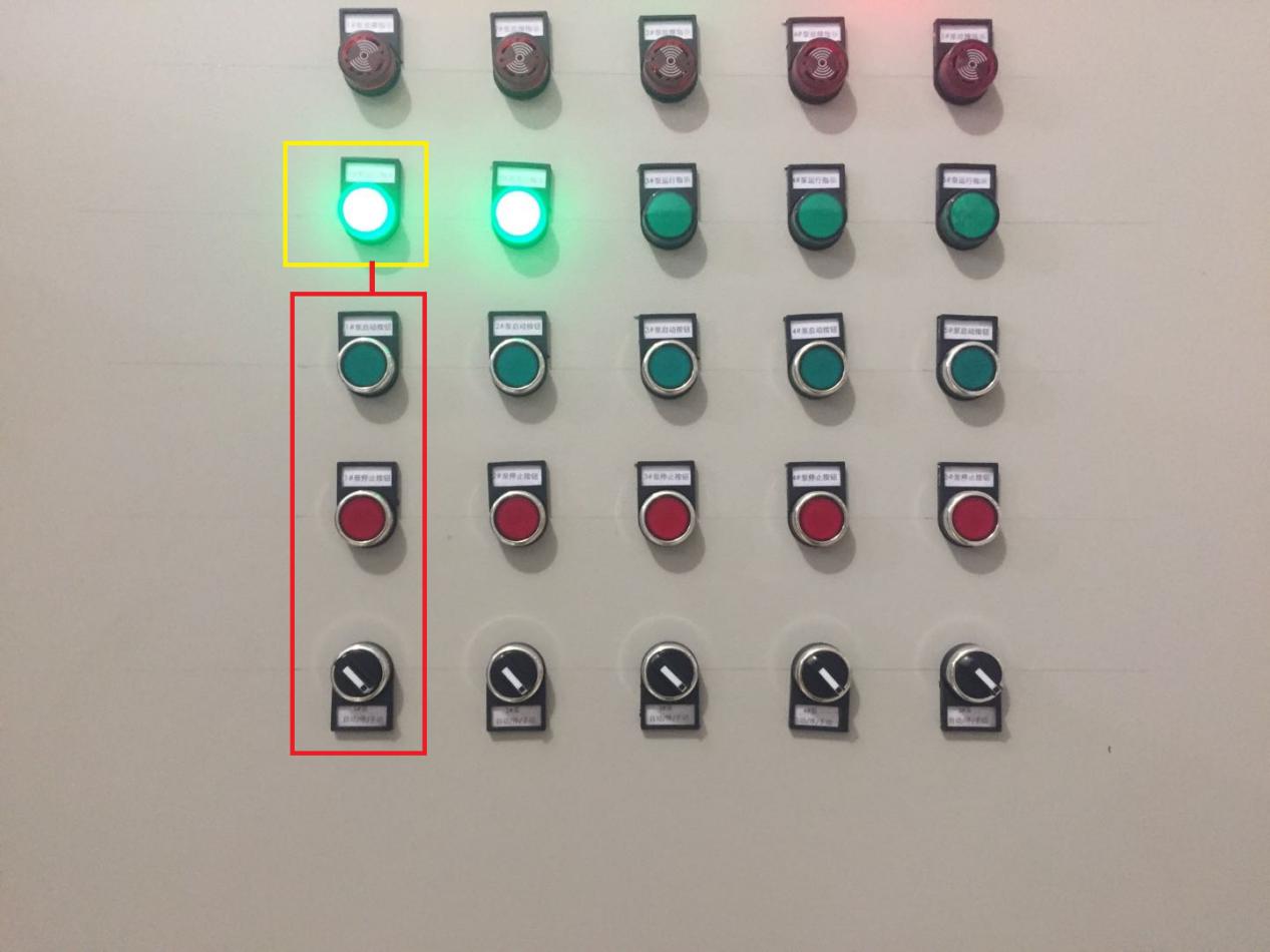 Ø 手自动选择、手动启动、手动停止按钮(红框内) Ø 当前状态(黄框内) 打到手动,使用手动启停按钮,启停水泵;打到自动,自动系统控制启停水泵。