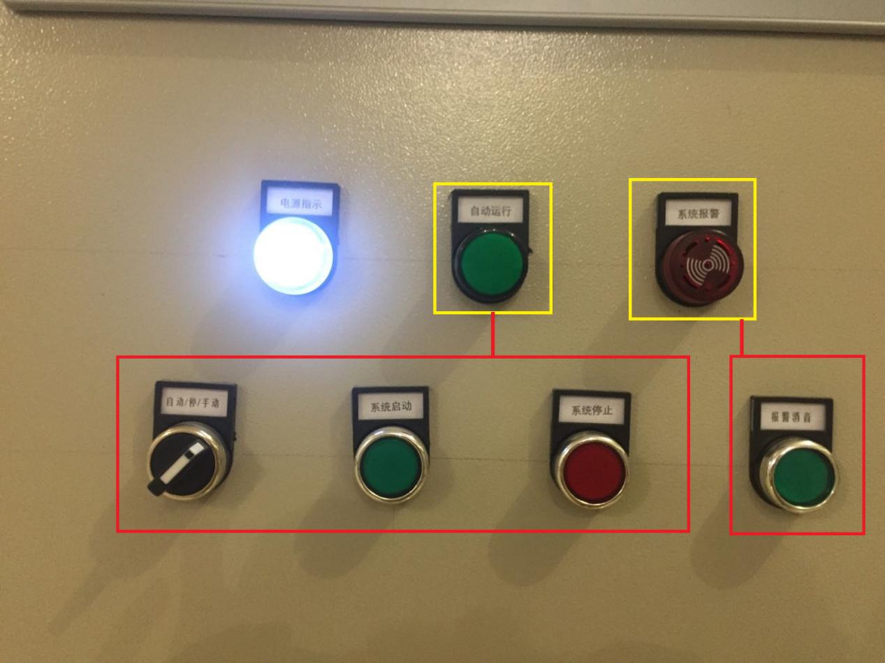 Ø 手自动选择、系统启动、系统停止(红框内) Ø 自动运行状态(黄框内)