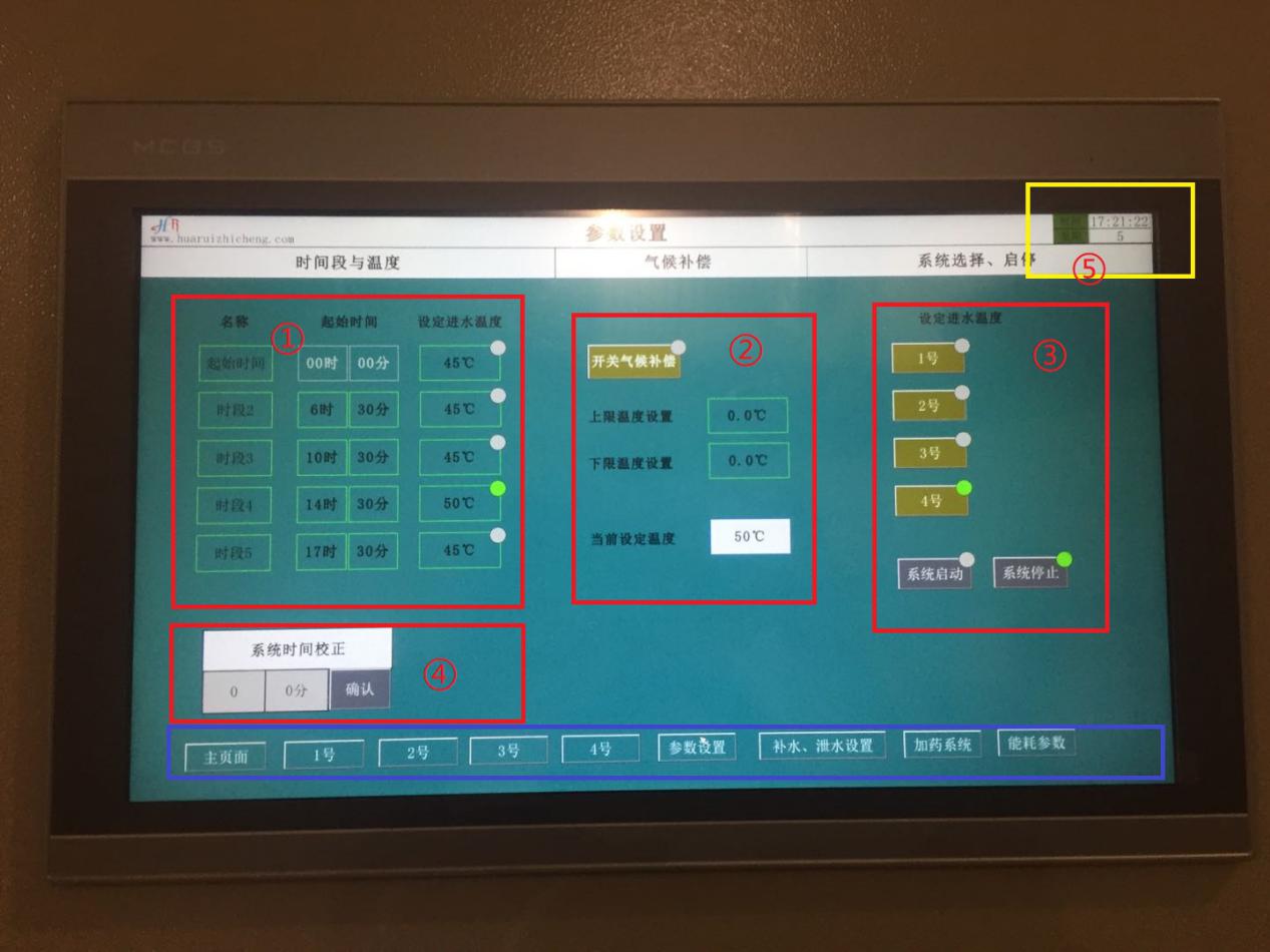 自动状态下的参数设置 ①时间段与温度 设置锅炉运行温度及对应的时间段,建议中午室外温度高、用热需求量小时,设置温度相对低。半夜室外温度低、用热需求量大时,设置温度相对高。 ②温度补偿 对寒冷天气和相对温暖天气进行温度补偿,开启温度补偿后,当室外温度降低时,系统会自动提高锅炉温度;当室外温度升高时,系统会自动降低锅炉温度。 其中上限温度、下限温度可分别设置为5℃和-5℃。 当前设定温度为自动状态下,锅炉实际设置温度。 ③系统选择及启停 当炉前泵和锅炉都打到自动状态,可通过本页面进行自动启停操作。 Ø 选择需要进行启停的系统(包含炉前泵与锅炉),绿色圆圈代表已选择。 Ø 进行系统启停,绿色圆圈代表已启动或已停止。 需注意,无论手自动,启动顺序:水泵→锅炉;停止顺序:锅炉→水泵。 自动状态下,水泵启动后,会有3-5分钟的延时,相应才会锅炉启动。同样,锅炉停止后,会有3-5分钟的延时,相应才会水泵停止。为正常现象,请等待。 ④系统时间校正 用于系统时间与实际时间的校正,输入正确的时间,点击确定按钮,可对⑤系统时间进行校正。 ⑤当前系统时间与星期