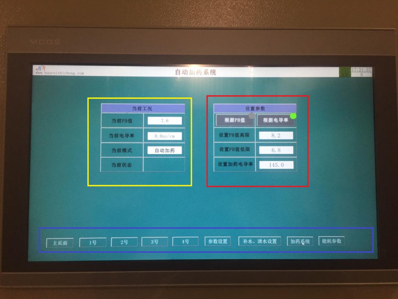 Ø 当前PH值和电导率 Ø 当前加药模式与当前加药状态。 2.5.2. 加药参数设置(红框内) 无需操作。 2.6. 能耗参数